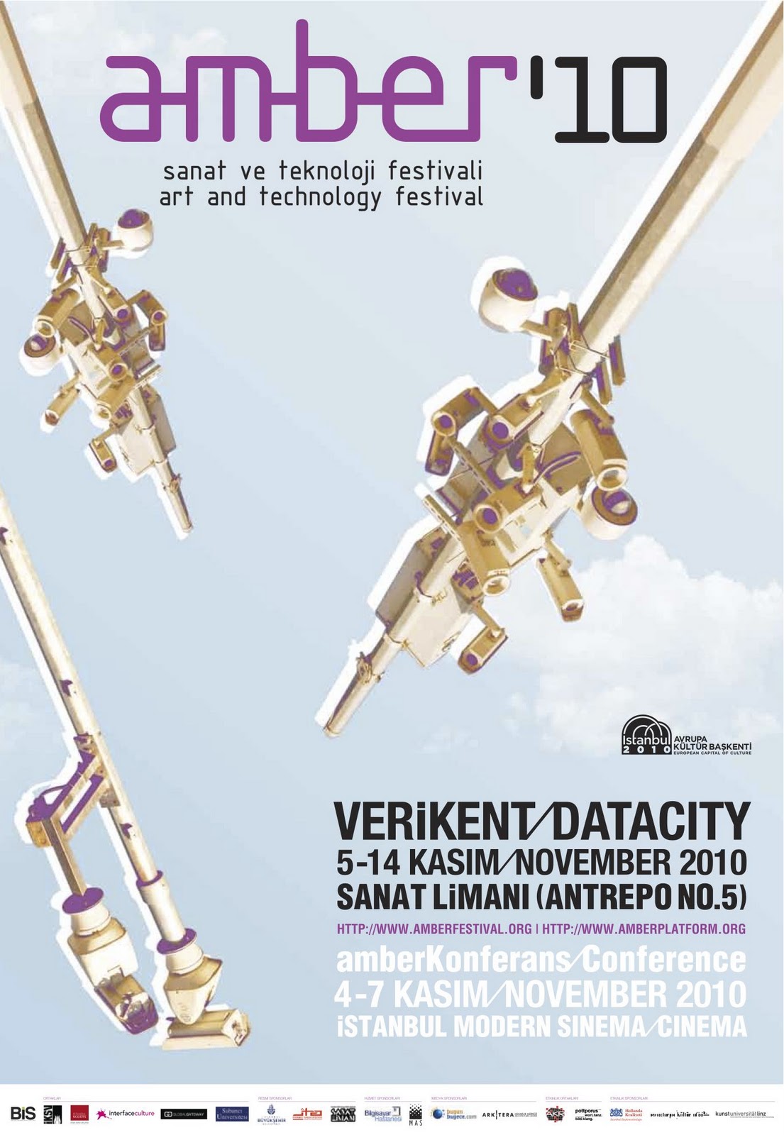 birkaç yıldır istanbul 2010 tarafından bile desteklenen amber, bu sene, ilginç bir sessizlikle başladı. cuma akşamı kulağımıza sönük bir fısıltısı geldi açılış kokteylinin. dün ve bugün talimhane tiyatrosu’nda gerçekleşen lunapark: izler, bellek, klişeler, küreselleşme isimli paralel etkinlik, yine tüm haftasonu boyunca istanbul modern’de gerçekleşen konferanstan siteye girip incelemesek haberimiz olmayacaktı. verikent üstüne yoğunlaşan bir festivalden beklenmeyecek bir duyuru başarısızlığı içindeler. ne yazık ki web siteleri de sanatı teknoloji ile birleştirdiğini iddia eden bir alanda çalışanlara yakışmayan bir tasarım ve içerik(sizlik)te.