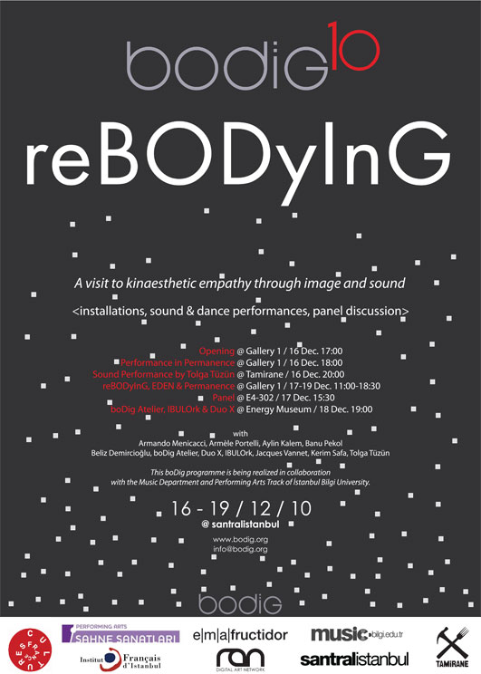 sadece 3 gün askıda kalacak yerleştirmeleri görmek için vakit sınırlı. bedenle empatiye imge ve ses üzerinden bir yaklaşım getiren yerleştirmelere yer verilen sergi bölümünde tolga tüzün’ün permanence isimli ses yerleştirmesi, aylin kalem’in armando menicacci ve diğer boDIG üyeleriyle gerçekleştirdiği reBODyInG yerleştirmesi (hareket eden bedeni izleyen kameraların etkileşimli olarak görüntü ve ses göndermesi temelli) ve jacques vannet ve armele portelli’nin eden isimli video yerleştirmesi bulunuyor.