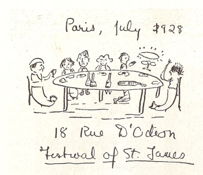 ps: ilk resim de ne derseniz: scott fitzgerald taptığı yazarlardan james joyce ile paris’te bir davette tanışma imkanı bulmuş. ancak çok çekingen olduğundan mıdır, yoksa şmpanyanın etkisinden mi, ne yapacağını şaşırmış ve dizlerinin üstüne çöküp joyce’un elini öpmüş ve “müthiş bir dahi olmak nasıl bir şey beyefendi? öyle heyecanlıyım ki sizi gördüğüme, hüngür hüngür ağlayabilirim!” demiş. işte bu da fitzgerald’ın bu gece ile ilgili bir çizimi…