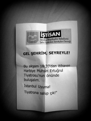 dün (29 nisan 2012) akşamüstü 5 sıralarında nişantaşı’nda yürüyoruz. kornalara basa basa bir araba konvoyu geliyor. kim bunlar, ne yapıyorlar diye anlamaya çalışırken az ilerimizdeki arabanın arka camı açılıyor, kaldırımın kenarına bir tutam beyaz kağıt çöp gibi atılıyor. bakıyoruz, bu insanların camdan çıkardıkları küçük yuvarlak pankartlarda “şehir tiyatroları yok edilemez” yazıyor. yere çöp gibi attıkları kağıt işte fotoğrafta gördüğünüz kağıt. bazıları daha akıllı, örneğin teşvikiye kafenin önünden geçerken insanların üstüne doğru atıyor, bazılarıysa görev bilinci gözlerini bürümüş olmalı ki bir tutam çöp gibi yere fırlatmaktan geri durmuyor.